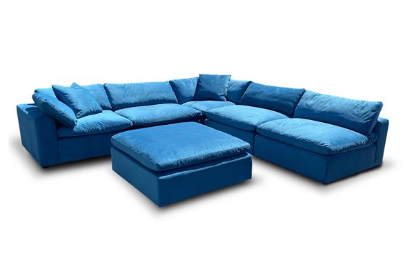The Capri Sectional blends plush, modular design with bold symmetry. Its low stance and generous proportions invite ease, while its sleek edges and clean tailoring bring a polished architectural touch to the room.