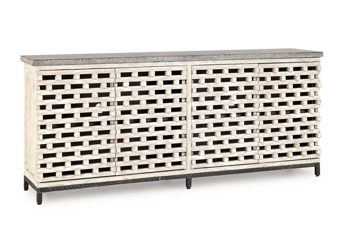 Bring character into your home with our Davenport Cabinet, crafted from reclaimed pine and topped with a blue stone surface. Supported by sturdy iron legs, it combines rustic charm with practical storage. A timeless addition to your living space.